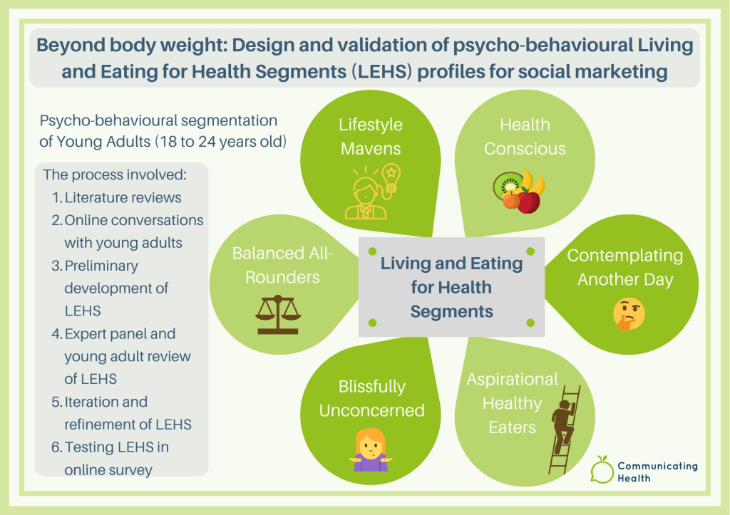 Segmentation has been explored in a number of different contexts – commercially, in practice and in academia. For example, Brennan et al. (2020) explored the dietary behaviours of young people to develop the Living and Eating for Health Segments (LEHS). The LEHS were part of a broader research project aimed at supporting health professionals to communicate health to young people. Check out the Communicating Health Toolkit for further information.